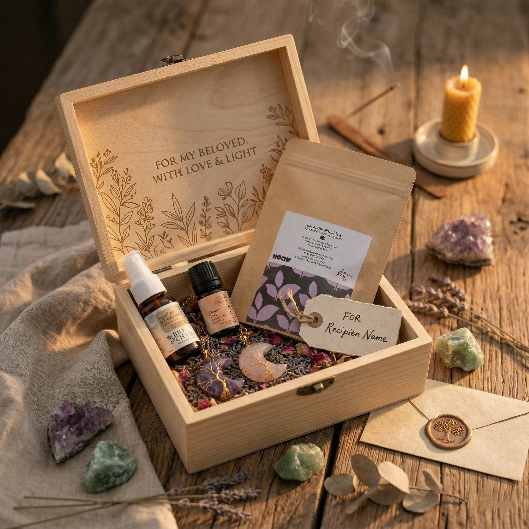 Every experience we offer is created with intention and care. Our collection includes ritual boxes, essential oils, gemstone bracelets, necklaces, and rings, each chosen to support mindful moments and meaningful practices in your daily life.